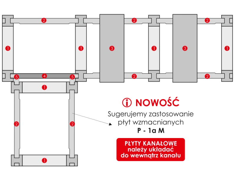 • Płyty przykrywające powinny być odpowiednio wypoziomowane po obu stronach kanału, co zmniejszy w znacznym stopniu możliwość powstania efektu klawiszowania płyt , powinny one być układane na płytach bocznych w ilościach zgodnych z wymiarem płyty bocznej np. dla płyty: P1A 192 cm – 6 płyt , P0A 132 cm – 4 płyty.